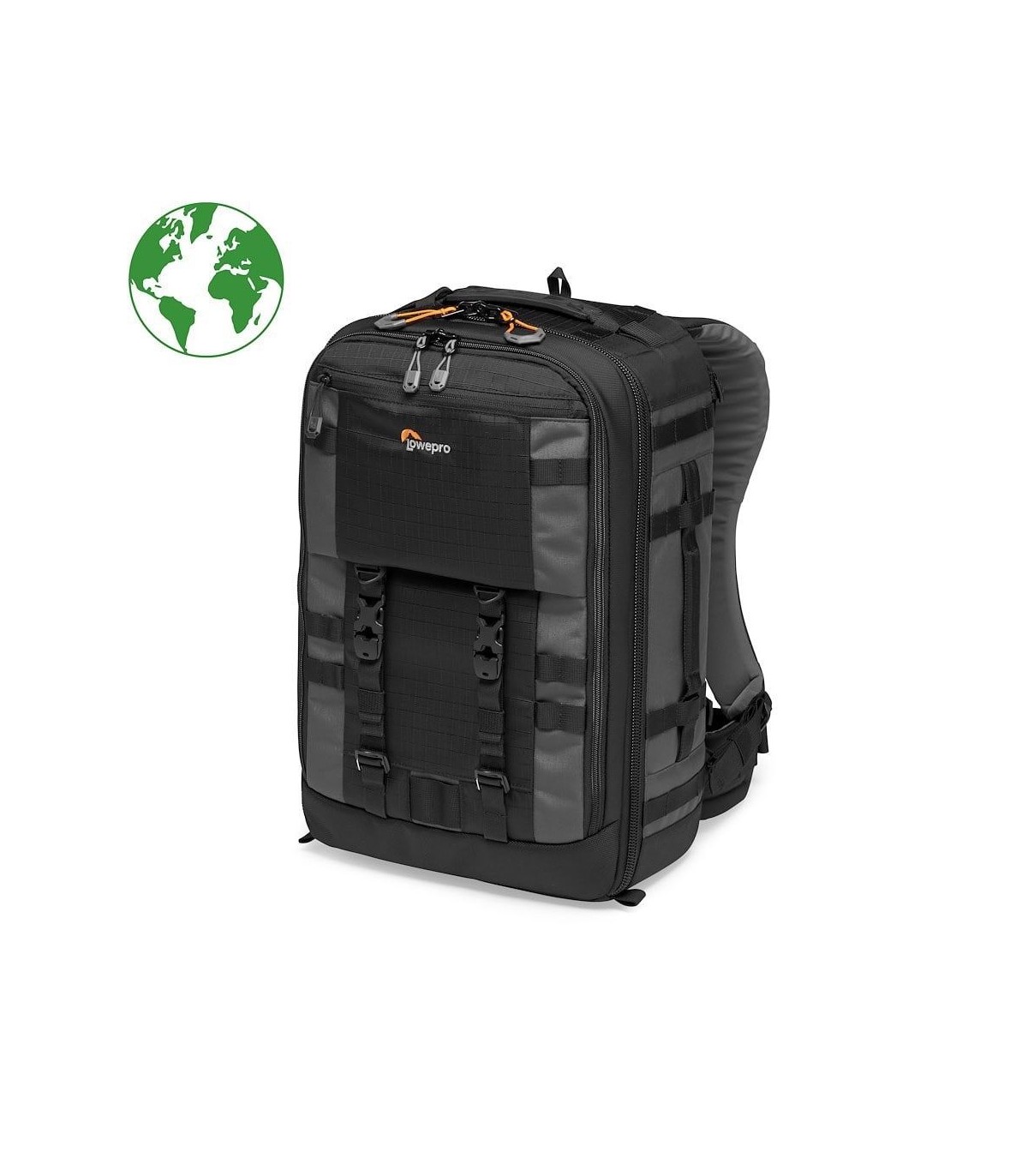 The Pro Trekker BP 350 AW II professional camera backpack is part of Lowepro's efforts toward sustainability through the Green Line project. It has been updated to include 75% recycled fabrics (consisting of straps, bindings, webbing, cords, and meshes) to reduce its negative impact on the environment.