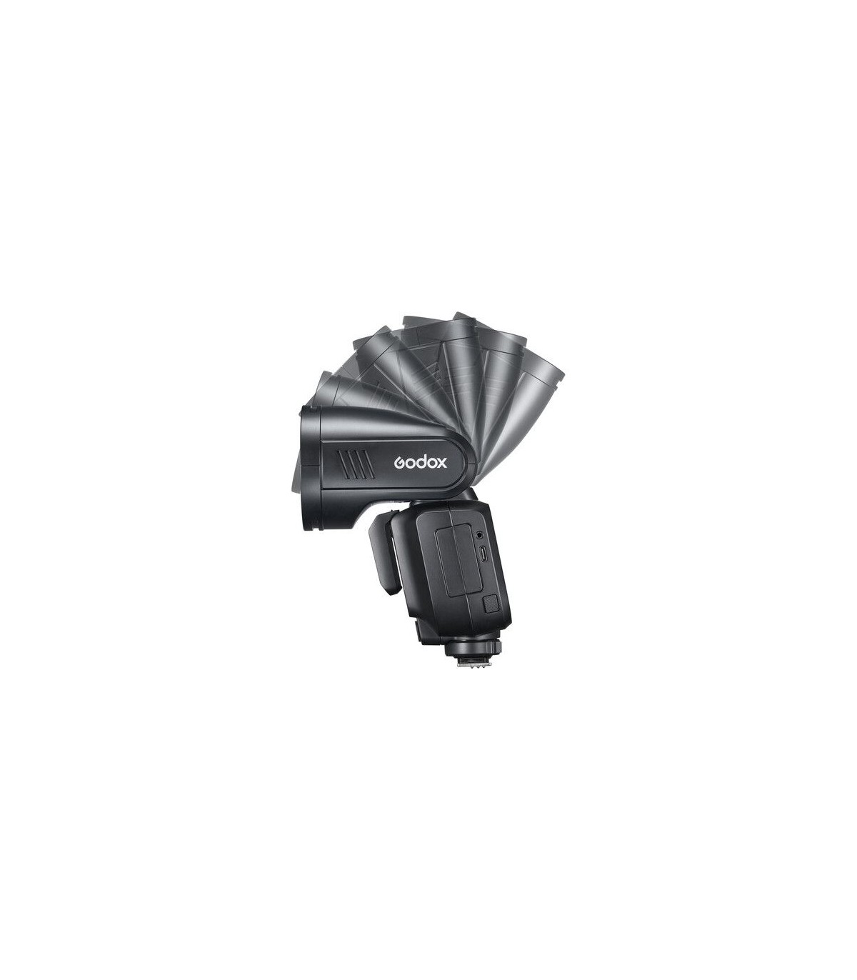 Powered by the same battery as the V1 Pro, the V100 can perform up to 400 full-power flashes, offering extended performance. The USB-C port adds convenience for charging, and the batteries can also be charged with the Godox VC26T charger (not included). Additionally, the V100 includes a port for the PB960 power module (not included), which reduces recycling time to just 0.8 seconds when connected.
